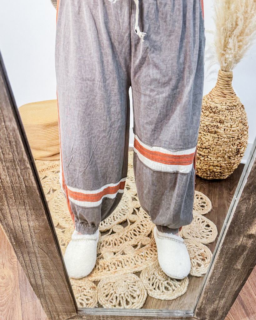 Our Alpine Stripe Joggers blend double gauze fabric with striking color-blocked patchwork for a one-of-a-kind artisanal style. Bold overlock stitches and exposed outseams create eye-catching details, while a hand-painted waist loop adds a unique, creative flair. Finished with a vintage-washed solid color, they offer a perfect balance of lived-in comfort and modern edge—ideal for those who want to stand out effortlessly.