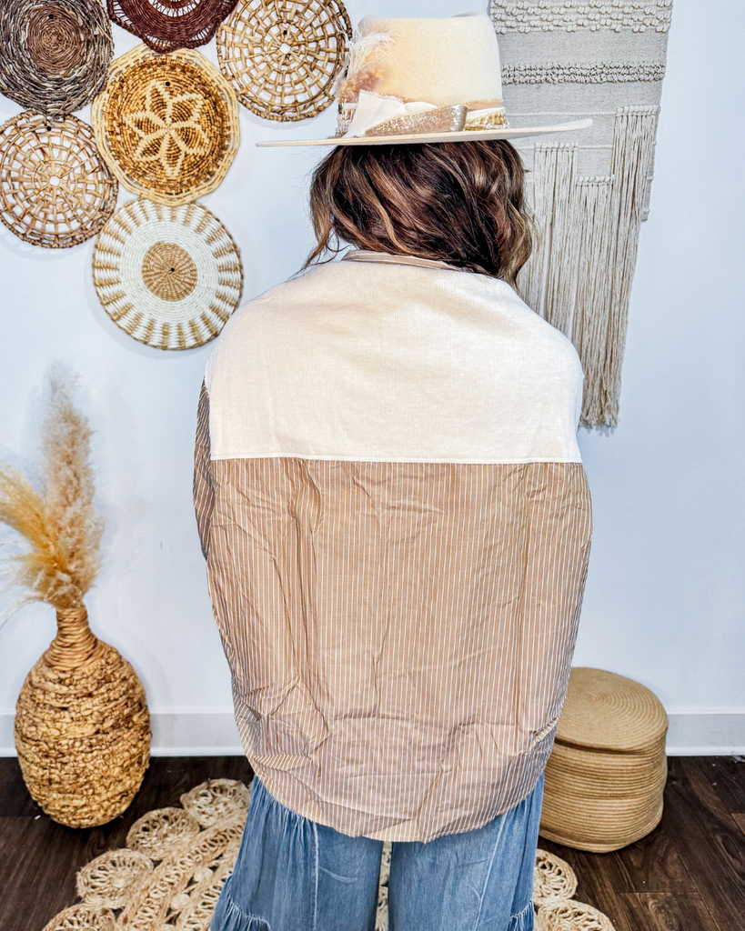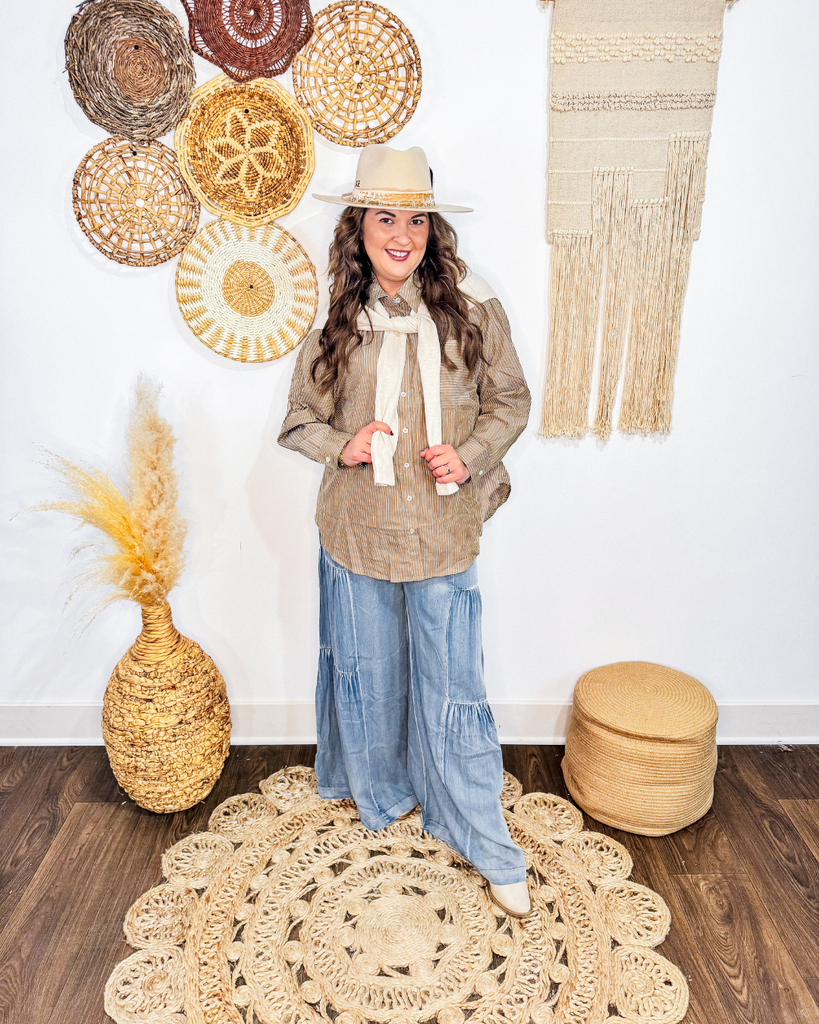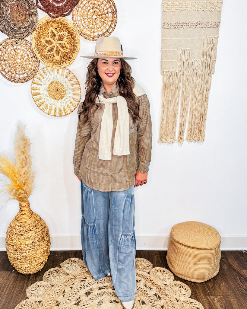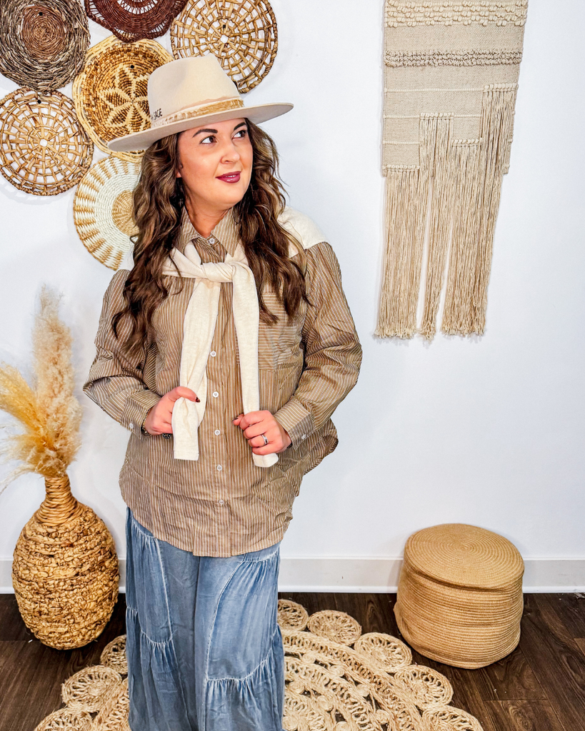 Our Classic Harvest Prep Button Down features stylish layered knit ties on the shoulders, adding a delicate touch to its classic striped design. Perfect for elevating any outfit, it combines comfort and chic details to keep you looking effortlessly polished all day.