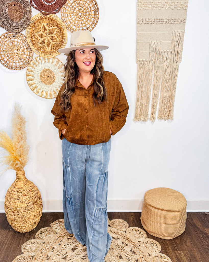 Elevate your casual wardrobe with our sophisticated Maple Hollow Suede Jacket. Its rich cognac brown hue and modern boxy silhouette make it perfect for layering during transitional seasons. Crafted from soft suede-effect fabric, it offers the stylish appeal of suede with hassle-free care. Designed with a snap button front, pointed collar, and relaxed long sleeves, this jacket combines classic style with comfort. The elasticized back hem enhances fit and shape, making it an effortlessly chic choice to pair with high-rise jeans, skirts, or shorts.