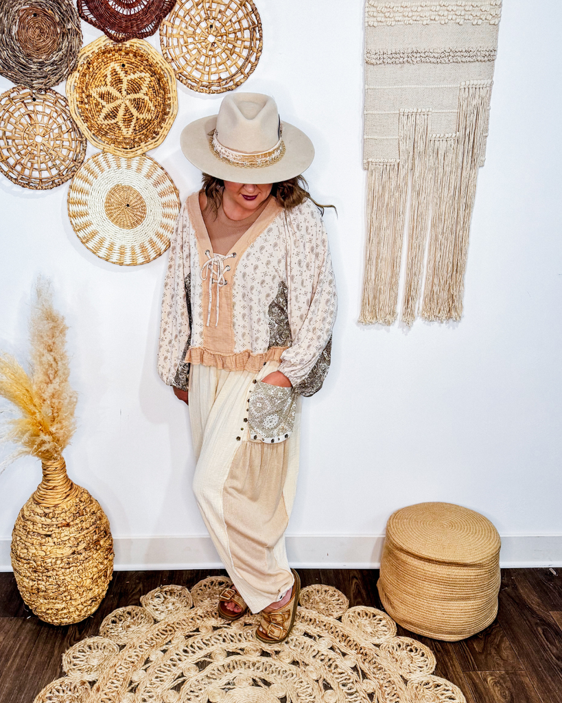 Our Oatstone Paisley Pocket Pants feature a harem style, relaxed fit crafted from soft double gauze fabric, ensuring all-day comfort and breathability. Featuring subtle stud details, they add a unique touch to your casual wardrobe while maintaining effortless style and ease of movement. Perfect for anyone seeking both comfort and standout design.