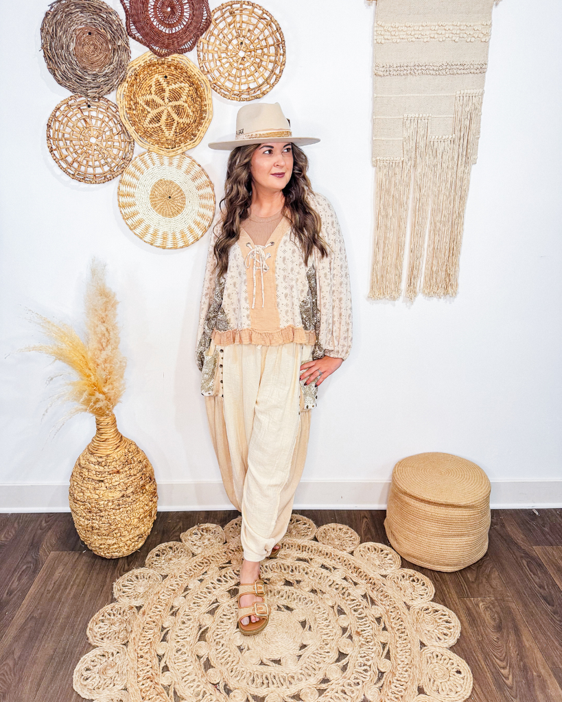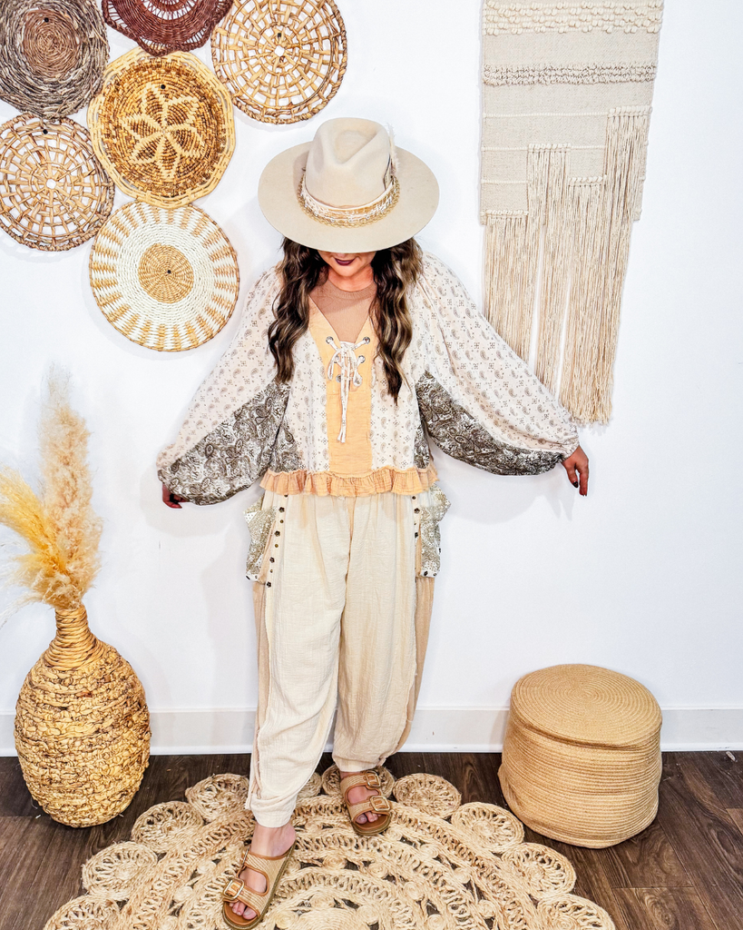 Elevate your wardrobe with our Autumn Whisper Paisley Top, featuring a flattering V-neck and oversized balloon sleeves for a stylish yet comfortable fit. Its delicate floral pattern and charming ruffle hem add a touch of feminine elegance, making it perfect for any occasion where you want to stand out effortlessly.